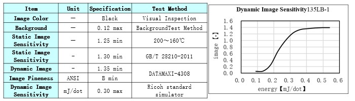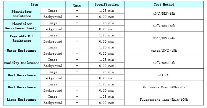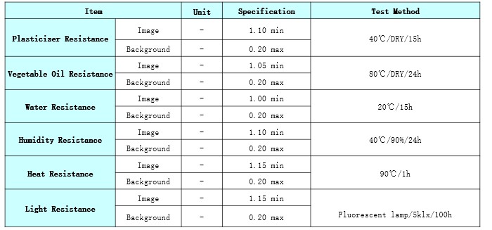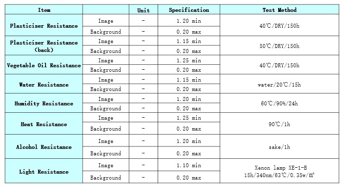 Product Caliper(μm) Heat Resistance Light Resistance Dynamic Sensitivity