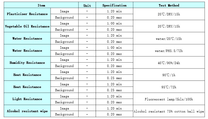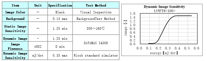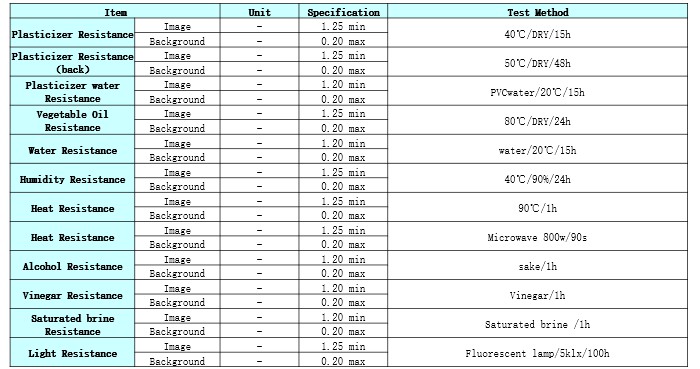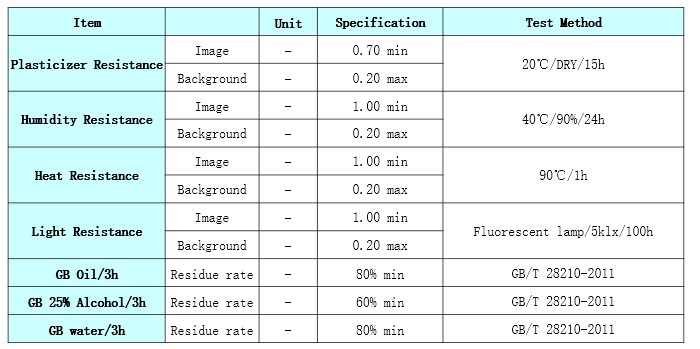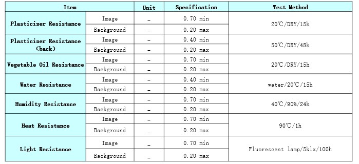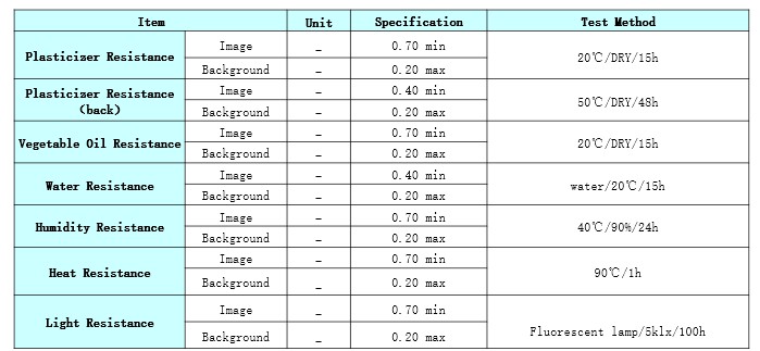 Product Caliper(μm) Heat Resistance Light Resistance Dynamic Sensitivity